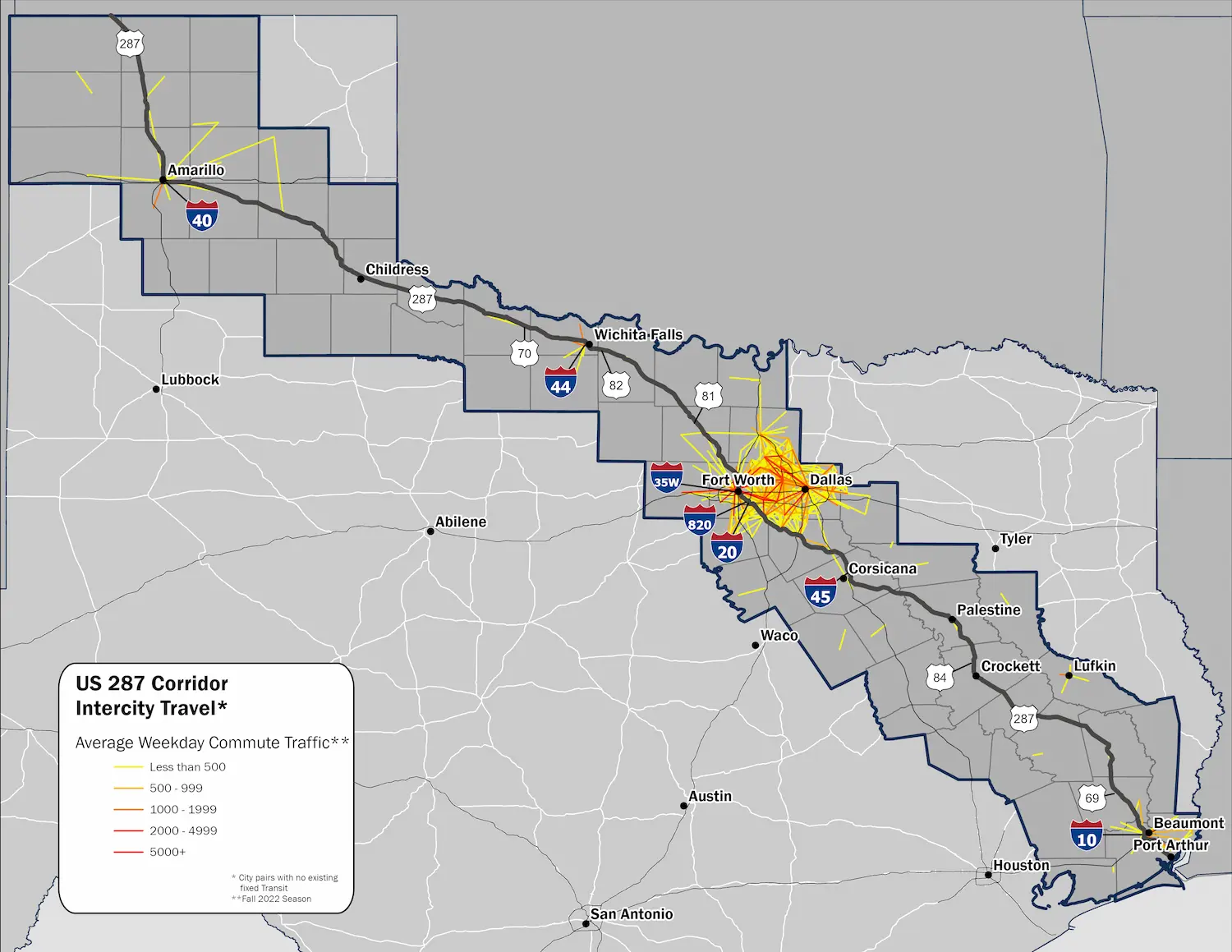 OTHON completed a comprehensive feasibility study of the 754-mile US 287 corridor, spanning 43 counties and nine TxDOT districts from Port Arthur to the Texas/Oklahoma state line. The study focused on evaluating multimodal needs—including freight, transit, and bicycle/pedestrian access—along one of Texas’s most critical freight and mobility corridors.